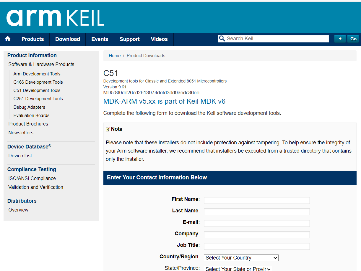 在C51产品下载页面,输入表单要求填写的内容,内容可以随便填写,建议认真填写,填写完成单击“Submit”按钮,提交表单后进入下载页面。