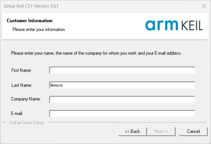 该步骤要求输入用户信息,所有信息都必须填入,不然无法继续安装。用户信息可以随便填入,安装程序会不验证填写的用户信息。输入完成后,单击【Next】按钮继续安装流程。