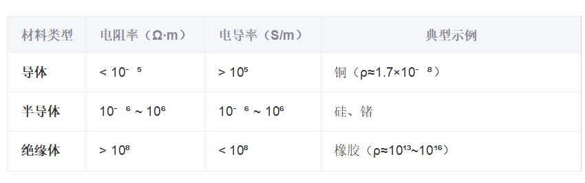 下表列出了导体、半导体和绝缘体的电导率和电阻率范围。