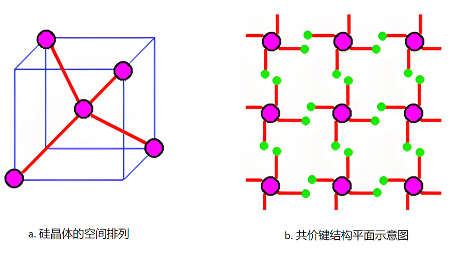 硅原子的原子核中有 14 个质子,核外有 14 个电子,电子分布在不同的能级轨道上,最外层有 4 个价电子。在硅晶体中,每个硅原子都与相邻的 4 个硅原子形成共价键 ,这 4 个硅原子分布在正四面体的顶点位置,以硅原子为中心,向四周伸展,从而构建起一个规则且稳定的空间网状结构。如下图所示: