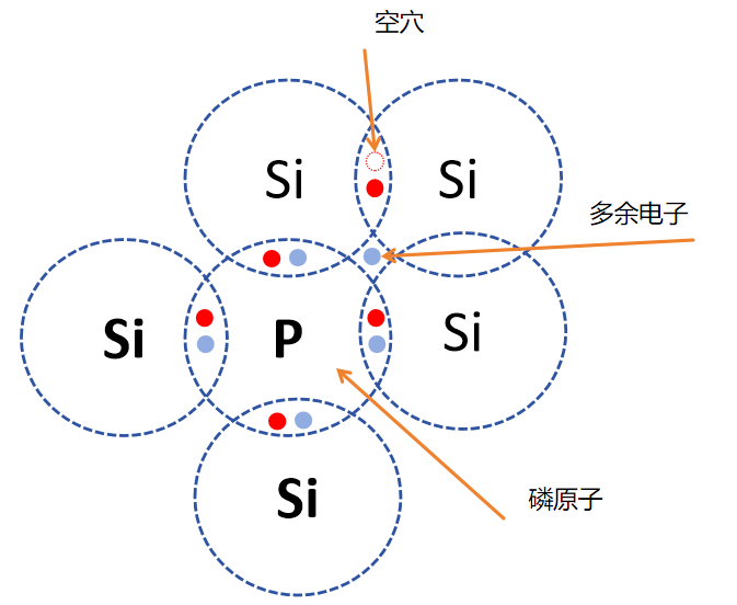 当在硅晶体中掺入磷等五价元素时,磷原子会取代硅晶体中的部分硅原子。由于磷原子最外层有 5 个电子,比硅原子多 1 个电子,在与周围硅原子形成共价键后,会多出一个自由电子。这些额外的自由电子增加了硅晶体中自由电子的数量,使得电子成为多数载流子,而空穴则成为少数载流子,此时以带负电的电子导电为主,这种半导体被称为 N 型半导体 ,“N” 代表 Negative,即负电的意思。