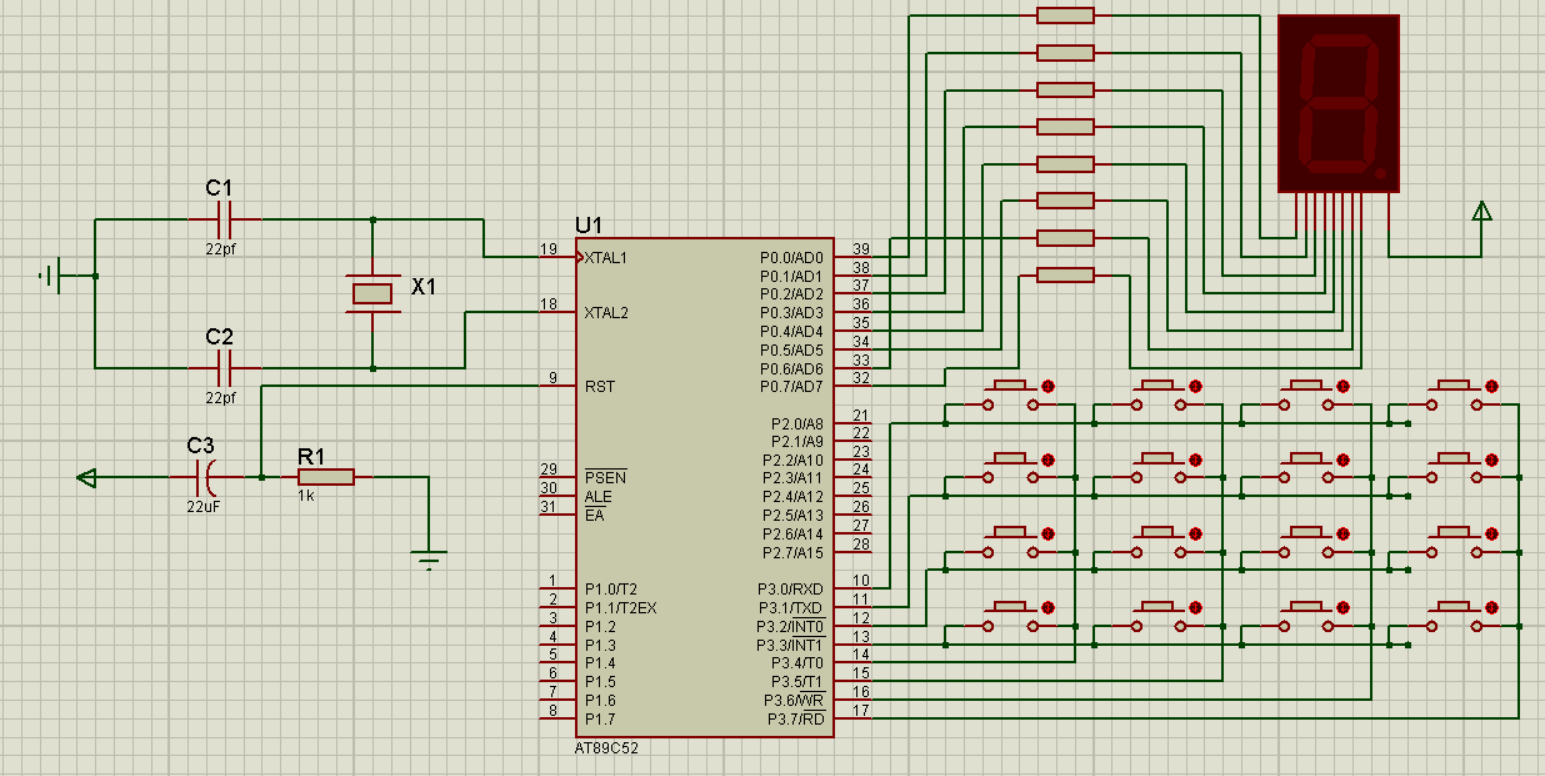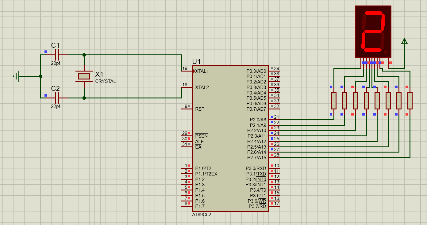 三、具备硬件电路设计与搭建能力:能根据元件清单(AT89C52单片机、7SEG-MPX1-CA数码管、220Ω电阻等),按照“引脚映射规范(a段→P1.0、dp段→P1.7)、电平逻辑(COM接+5V)、保护电路(串联限流电阻)”完成数码管驱动电路搭建,同时正确连接单片机外部晶振电路。