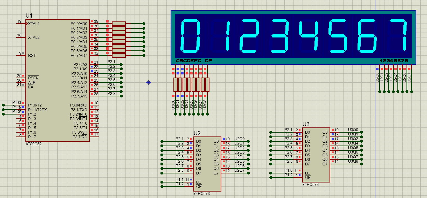 3、熟悉利用锁存器控制8位数码管的电路设计思路,包括元件选择(AT89C52单片机、7SEG-MPX8-CA数码管、74HC573锁存器等)、连接方式(数据端口与锁存器输入端连接、锁存器输出端与数码管对应引脚连接等)及工作时序(段选信号与位选信号的传输过程)。