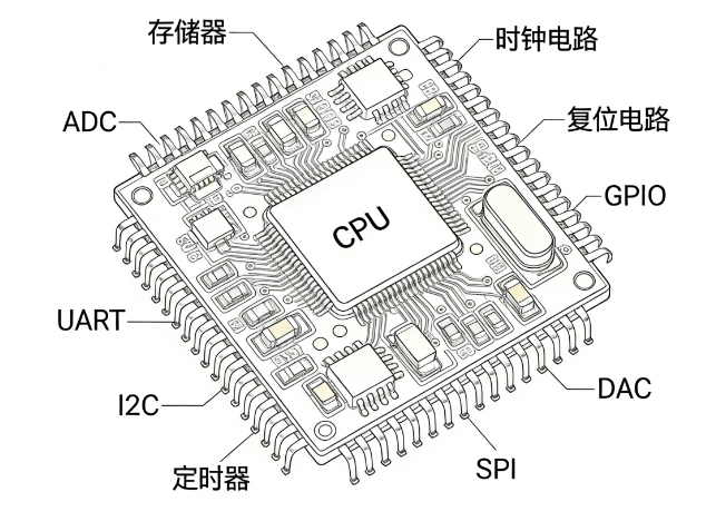 MCU通过高度集成实现”单一控制”目标,其设计哲学强调在单一芯片上集成CPU、存储器、时钟电路、复位电路以及多种通用外设(如GPIO、ADC、DAC、UART、SPI、I2C、定时器等)。这种集成方式使其能够独立运行,无需外接复杂硬件,从而满足低功耗、低成本的需求,并专注于确定性实时控制任务。