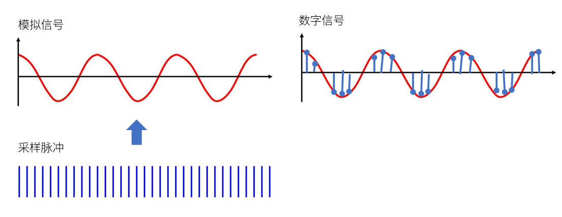 模拟信号是输入信号,连续输入到ADC,采样脉冲由ADC产生,采样脉冲通过硬件电路,保留模拟信号的瞬时电压值,ADC将保留的模拟信号的瞬时电压值转换为数字量,并按一定的编码形成给出转换结果,然后开始下一次采样。